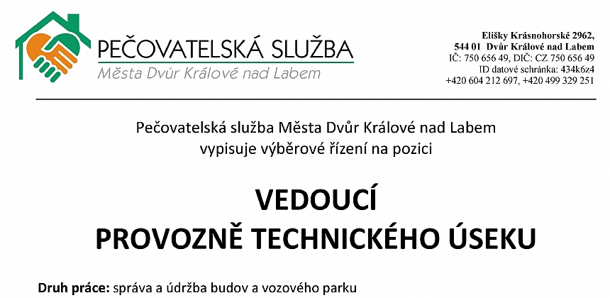 Pečovatelská služba Města Dvůr Králové nad Labem vypisuje výběrové řízení na pozici VEDOUCÍ PROVOZNĚ TECHNICKÉHO ÚSEKU.